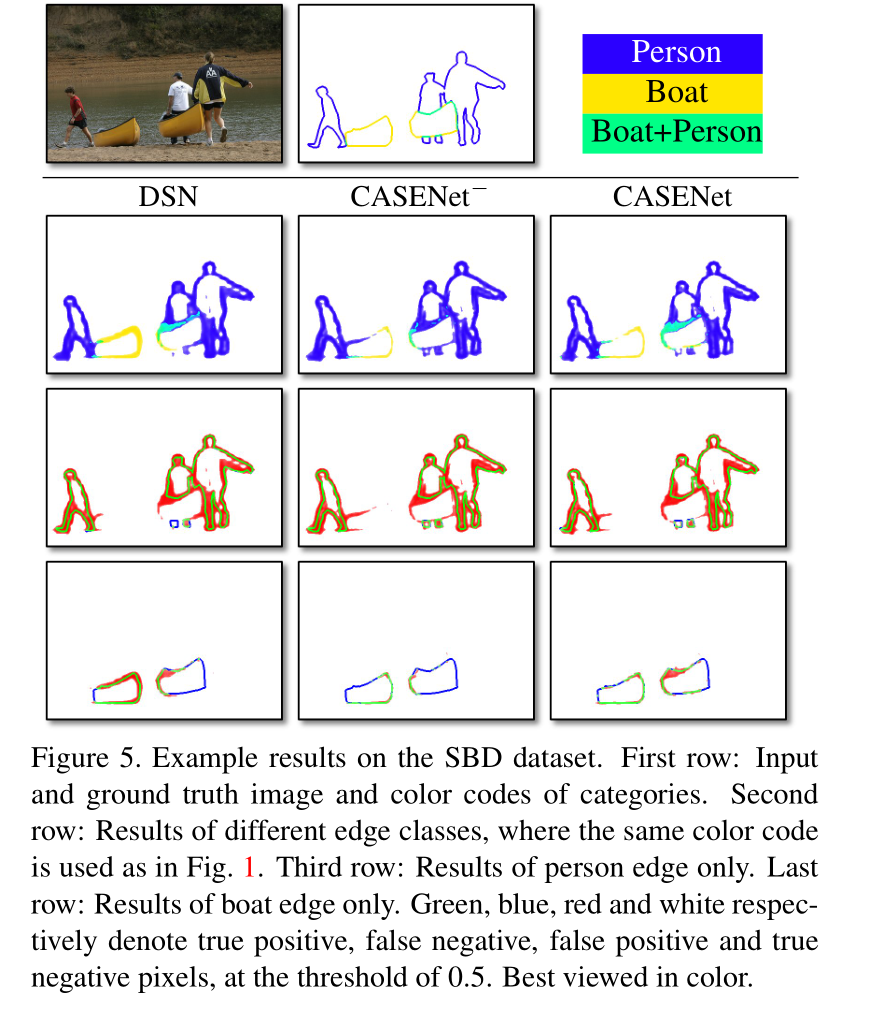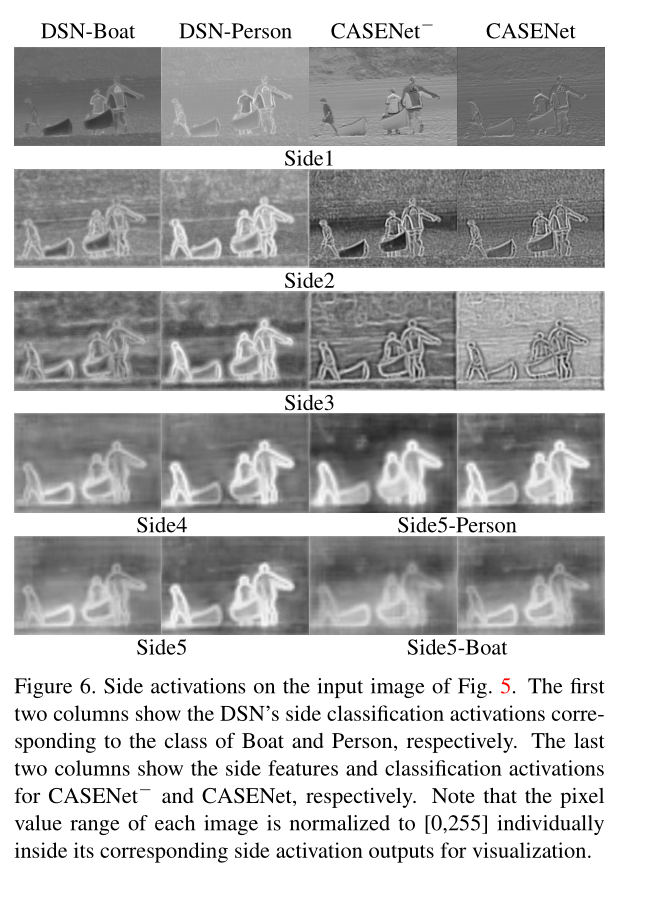请注意,每个图像的像素值范围在其相应的侧面激活输出内分别标准化为[0255],以便可视化。这可能是由于对这些层施加了分类要求,考虑到接收范围和信息有限,这似乎有点咄咄逼人,可能会导致性能下降。此外,你可能会注意到CASENet之间“Side5 Person”和“Side5 Boat”的区别−和CASENet,CASENet的激活整体上包含更尖锐的边缘,再次显示了Side-5 监管的好处。