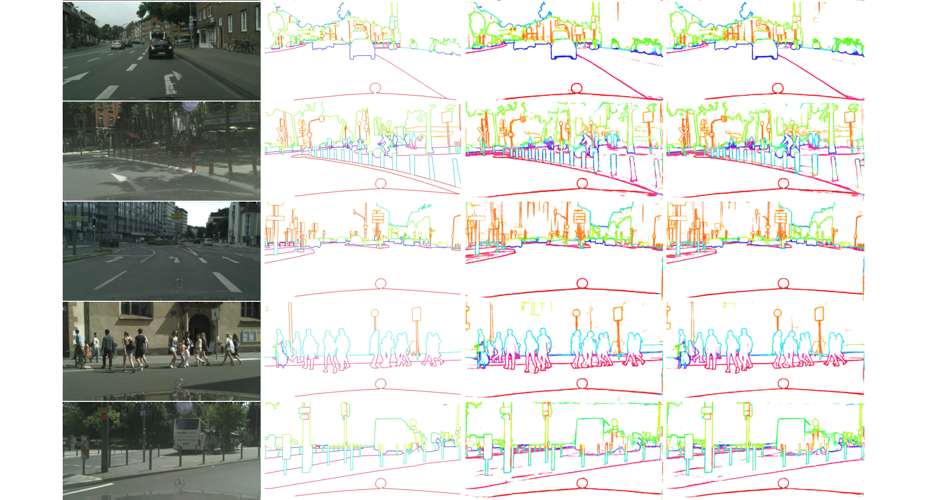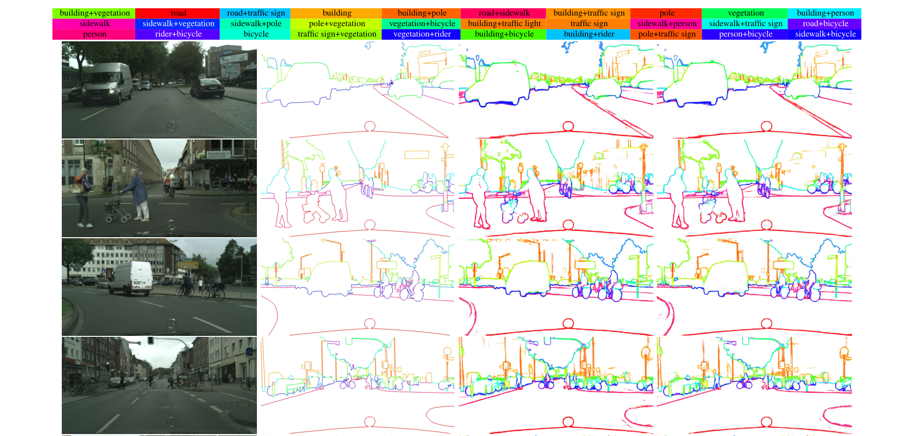 给定一幅街景图像,我们的目标是同时检测边界,并为每个边缘像素分配一个或多个语义类别。