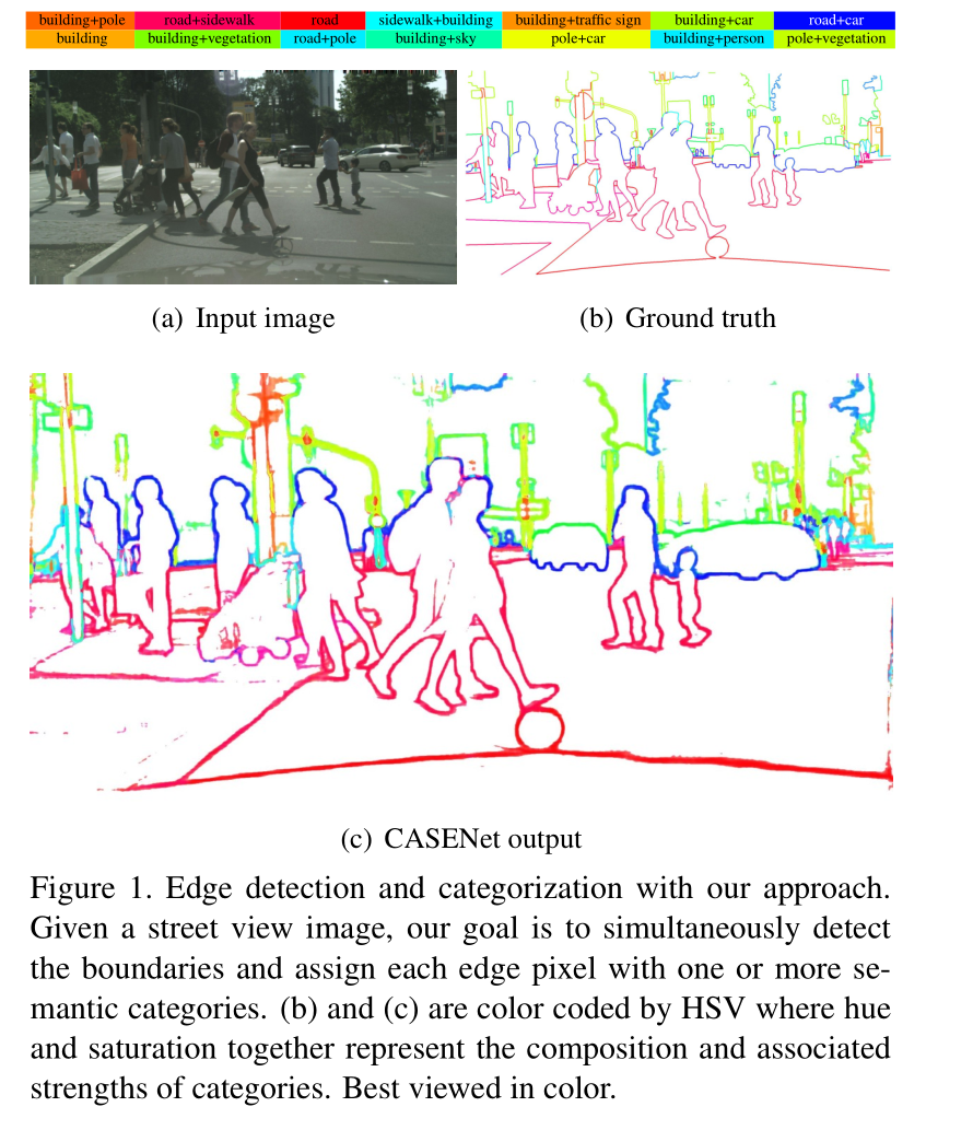 (b) 和(c)用HSV进行颜色编码,其中色调和饱和度共同代表类别的组成和相关强度。图1显示了Cityscapes数据集[8]中的道路场景图像,其中包含多个对象类别,如建筑、地面、天空和汽车。特别是,我们研究了同时检测边缘像素并根据与一个或多个对象类别的关联对其进行分类的问题[18,42]。例如,位于分隔建筑物和极点的轮廓上的边缘像素可以与这两种对象类别相关联。在图1中,我们将边界可视化,并列出典型类别组合的颜色,如“建筑杆”和“道路人行道”。在我们的问题中,每个边缘像素由一个向量表示,该向量的各个元素表示像素与不同语义类的关联强度。虽然大多数边缘像素将仅与两个对象类别相关联,但在交叉点[37]的情况下,人们可能期望边缘像素与三个或更多个对象类别相关联。因此,我们不限制一个像素可以关联的对象类别的数量,并将我们的任务表述为一个多标签学习问题。在本文中,我们提出了CASENet,一种能够检测类别感知语义边缘的深度网络。给定定义的语义类别,网络基本上会生成K分离的边缘映射,其中每个映射表示某个类别的边缘概率。图2给出了测试图像上单独可视化的边缘映射的示例。