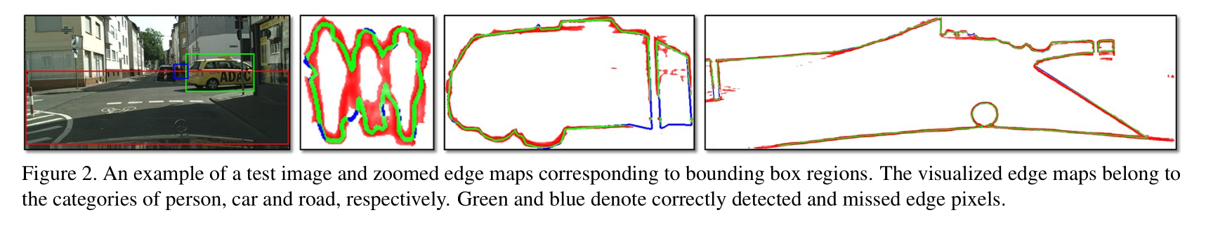 图2。对应于边界框区域的测试图像和缩放边缘贴图的示例。可视化的边缘地图分别属于人、车和路的类别。