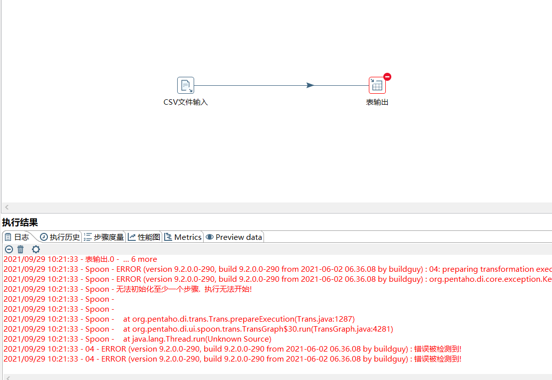 在此之前我就完成了一次抽取,再做第二次的时候已经是很熟悉了,但是仍然出现了问题,在我进行第二次转化之前运行了上一次转换,出现了下图的错误。