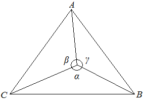 此时,这两个圆都会通过A、B、C三点,点P会在这个圆上。显然这个圆就是三角形ABC的外接圆。点P在这个圆的任何位置都能保证三个夹角为α、β、γ。