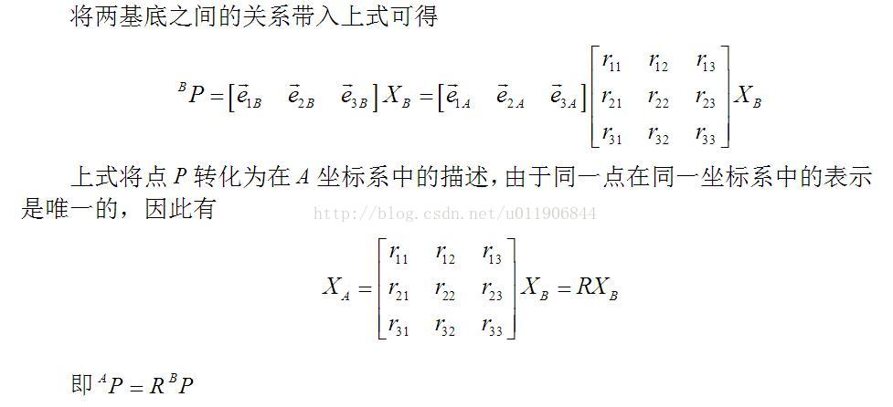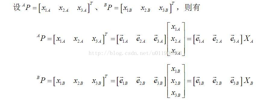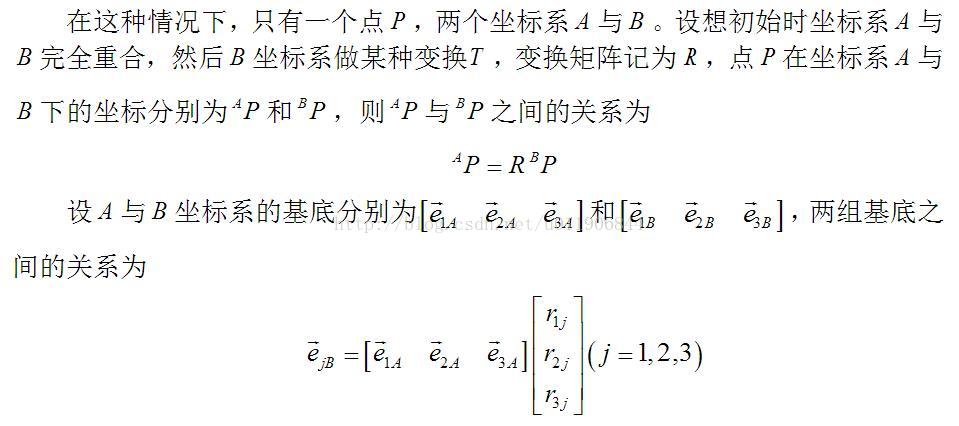 其中变换矩阵R由三列构成,第一列为坐标系B的x轴相对于坐标系A的描其中变换矩阵R由三列构成,第一列为坐标系B的x轴相对于坐标系A的描其中变换矩阵R由三列构成,第一列为坐标系B的x轴相对于坐标系A的描述,第二列为坐标系B的y轴相对于坐标系A的描述,第三列为坐标系B的z轴相对于坐标系A的描述。