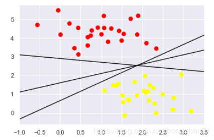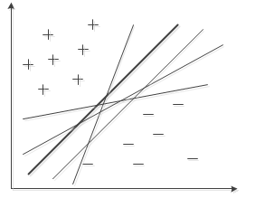 如上图,将两类样本点分开的直线有无数多条,那么 SVM 选择最优的一条直线即上述推导,使离分割超平面最近的点的距离最大,也就是几何间隔最大化。从图中观察可知,中间最粗的黑色直线是当前最好的分割超平面。
