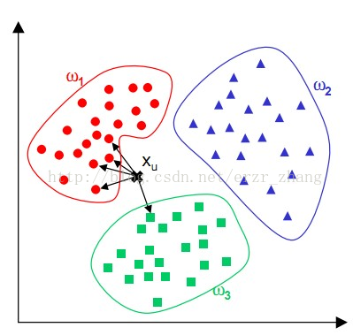 里的每个点求距离,然后挑离这个训练数据最近的K个点看看这几个点属于什么类型,然后用少数服从多数的原则,