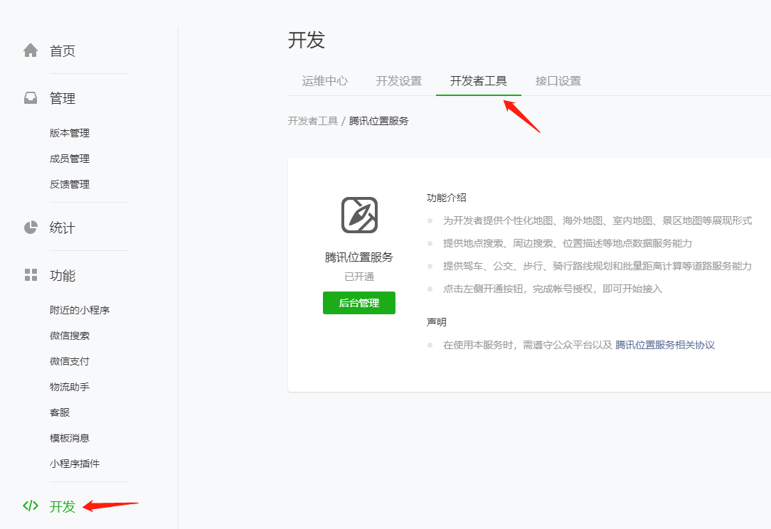 个性化地图能力可在小程序后台“设置-开发者工具-腾讯位置服务”申请开通