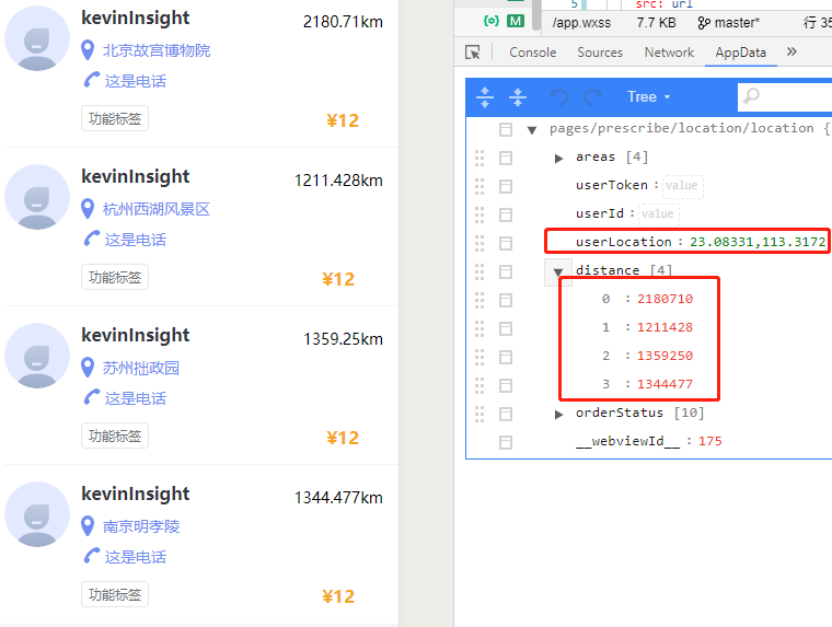 3# 根据用户当前位置,计算出 与 接口返回的目的地数组中每条地址的相距距离