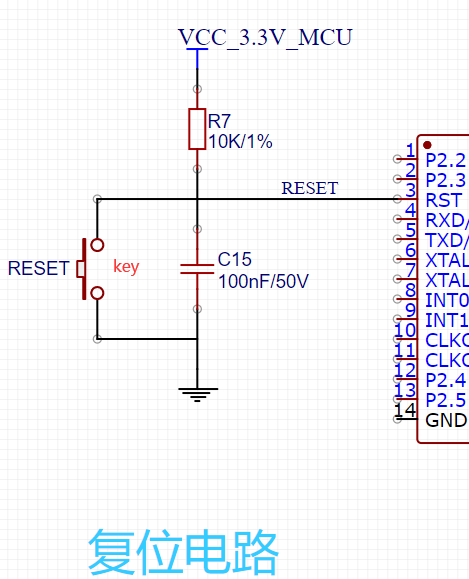 如图,复位电路,电平低有效。我们当然是希望MCU上电时复位是处于无效状态的,所以使用上拉电阻,当key断开时是把输入电平拉高。当我们需要复位时,才可通过闭合key把电平拉低来进行复位操作。