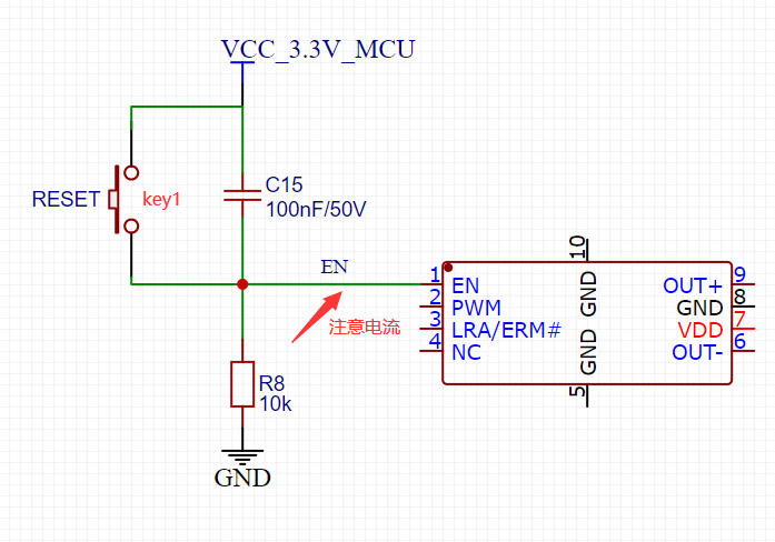 同理,下拉是把输入控制在低电平。如图,EN高电平有效,在key1断开时,EN信号线一直是低电平。在key1闭合时电平才拉高,起到了控制使能的作用;(注意信号输入线的电流大小,判断是否加限流电阻)