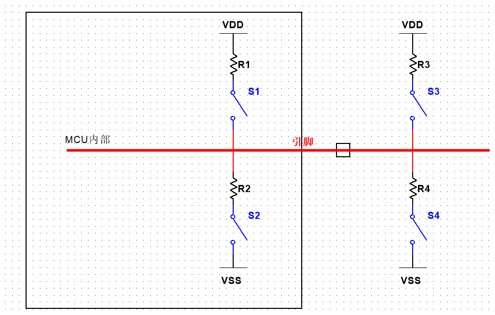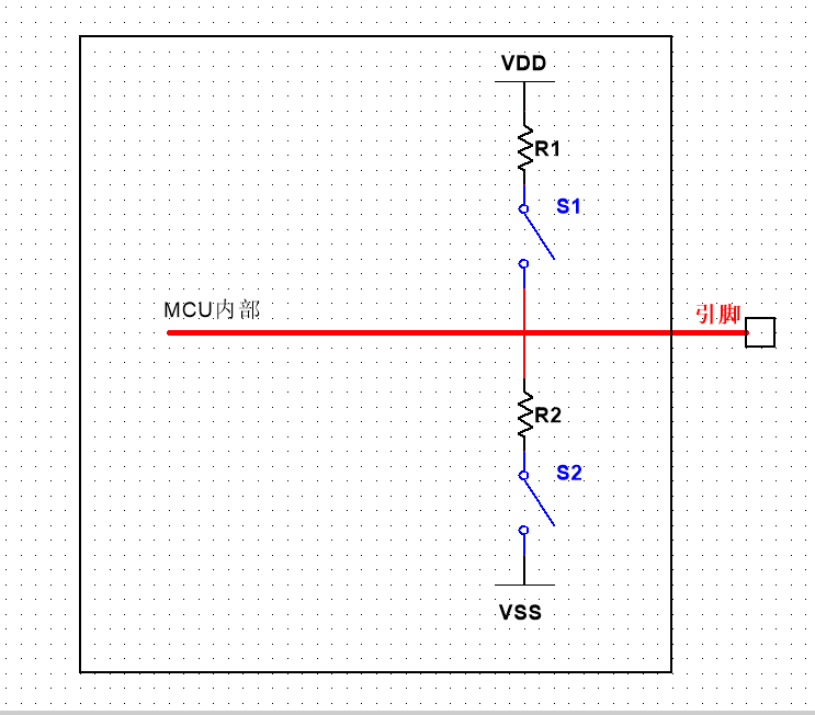 如图R1为上拉电阻,R2为下拉电阻。可通过配置S1和S2来设置模式(上拉,下拉,浮空);