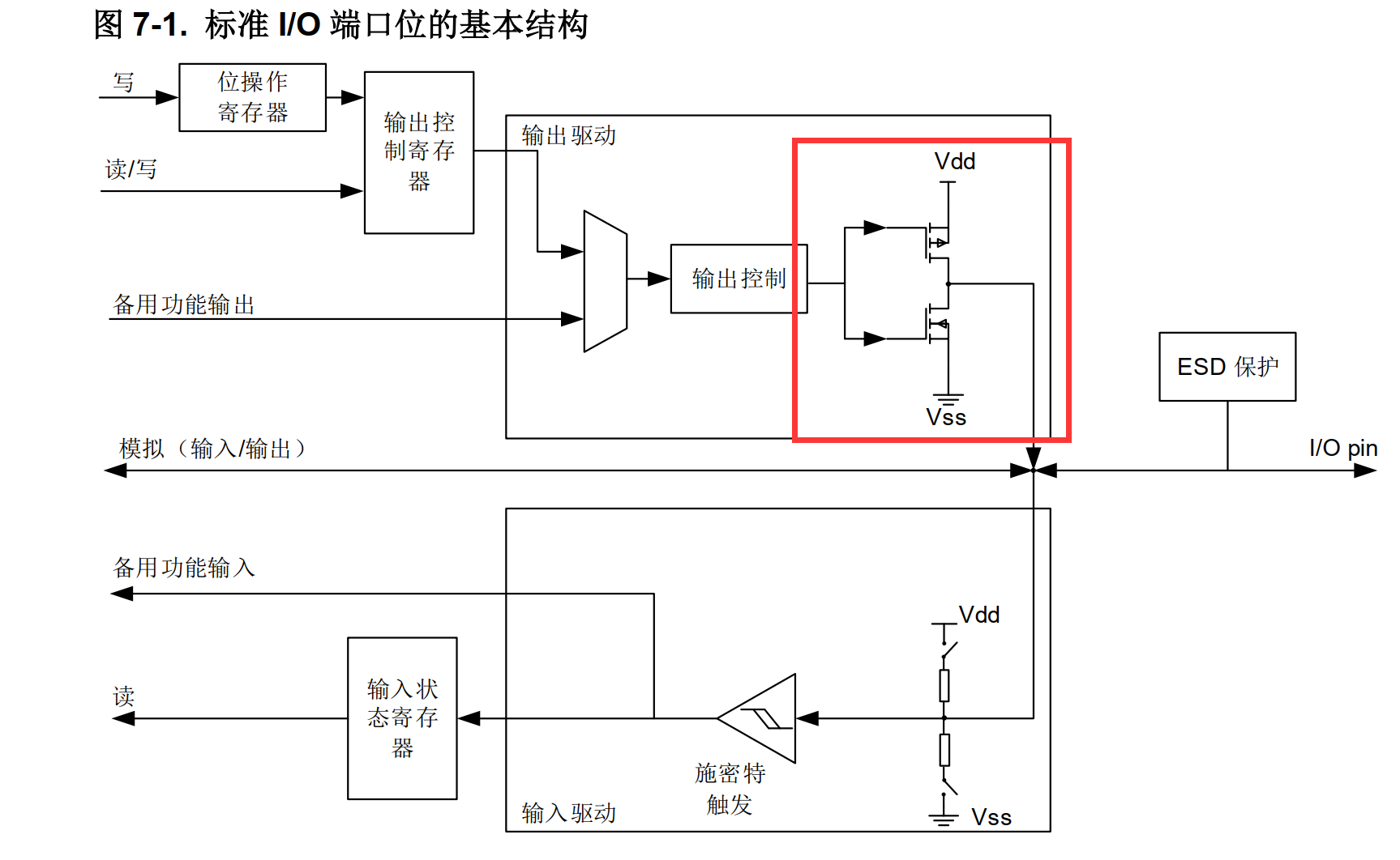 如图红框部分可通过软件选择开漏或推挽输出,当两个MOS都激活时就是典型的推挽输出模式。推挽输出的特点:1.可以输出高低电平,高低电平幅度由Vdd和Vss决定;2.有比较强的驱动能力(输入或输出电流能力);