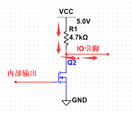 当内部输出"L"时,Q1截止,此时IO引脚悬空,IO引脚无法输出高电平,没有驱动能力。因此使用时需外接一个上拉电阻R1到电源VCC,OC门依靠上拉电阻以输出高电平,驱动电流由VCC提供。同理OD结构也是如此。其结构如下图: