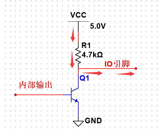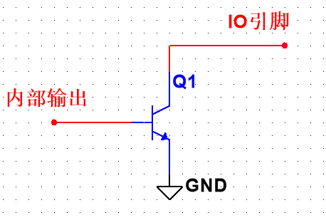 我们以OC结构为例,当内部输出"H"时Q1饱和导通,将对应输出IO引脚拉为低电平“L”,即IO口输出低电平;