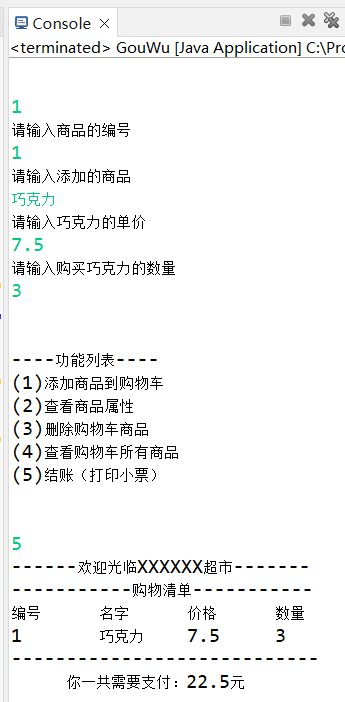 System.out.println("(5)结账(打印小票)");