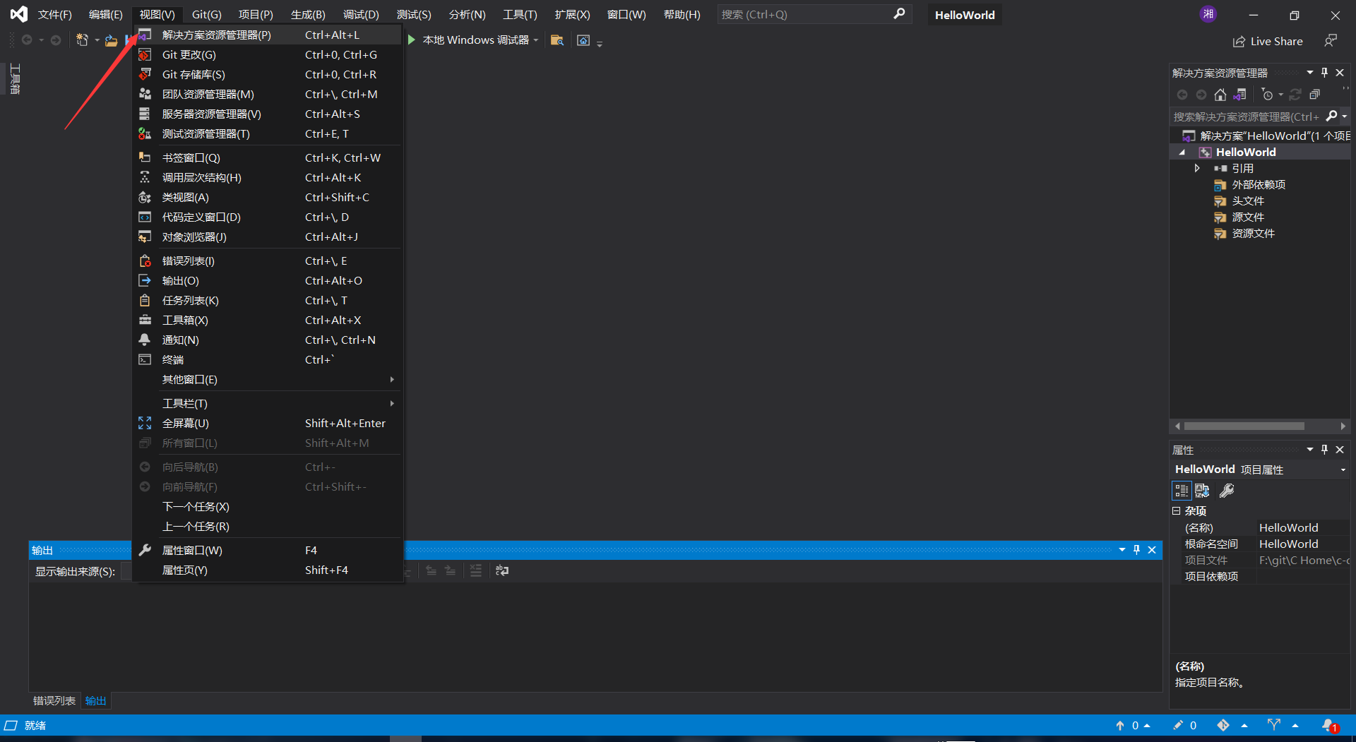 如果在自己的VS界面里没有看到右侧的解决方案,可以从右上角的视图里显示出来。