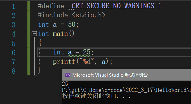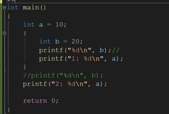 而此处a定义在main里的设定范围内,它以下的语句都是它是设定范围;