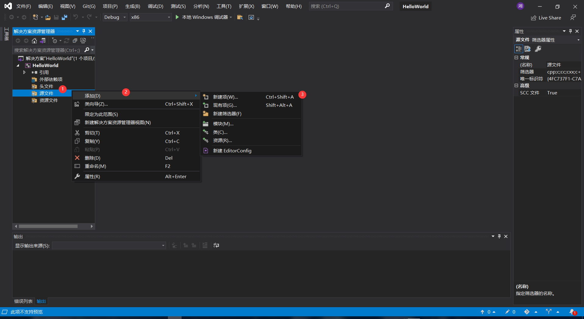 (2)第二步:我们需要在左侧解决方案里创建一个源文件,再进行编辑代码。