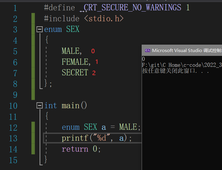 下面代码是枚举类型的基本格式,枚举类型里的可能取值就是枚举常量,彼此用逗号分开。(注意花括号结尾要带分号)