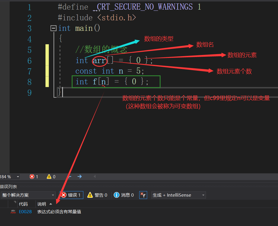 (1)在初始化数组的时候,里面下标标的是常量表达式,不能是变量表达,即使是改成const也不行,const修饰完后是变成常变量,本质上还是变量(数组是存储同一种数据类型多个元素的集合,可以看成是存储相同东西的容器)。