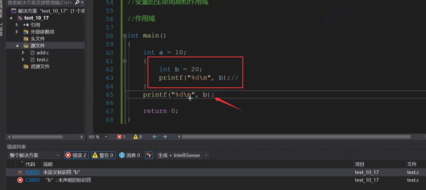 关于生命周期,main函数结束就是程序结束,我们可以理解成程序和main函数的生命周期是一样;作用域也有生命周期,离开了作用域,作用域里面的变量会销毁,出了作用域就用不了。