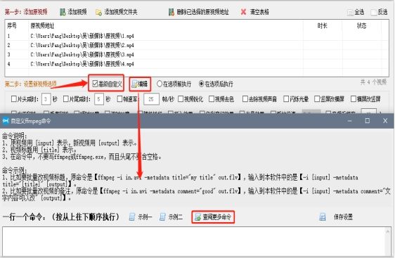 2) 视频添加到表格里,就开始设置视频的剪辑选项,勾选“高级自定义”,并且点击“编辑”,就会出现一个新的窗口,点击窗口里的“查阅更多命令”。