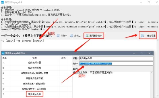 3) 在里面选择“视频倒放效果”,复制该命令,然后将复制好的命令粘贴到窗口的文本框里,点击“保存设置”就算完成了。