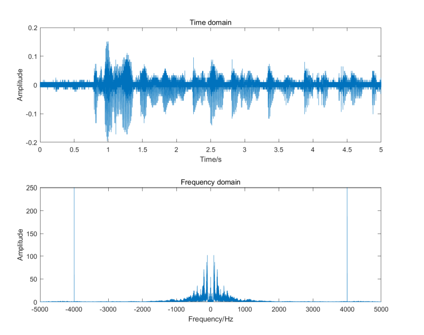 加入了一个振幅0.2,频率为4000Hz的余弦信号,可以观察到时域中叠加了一个高频余弦信号,幅度谱中在±4000Hz处有明显的频率分量。