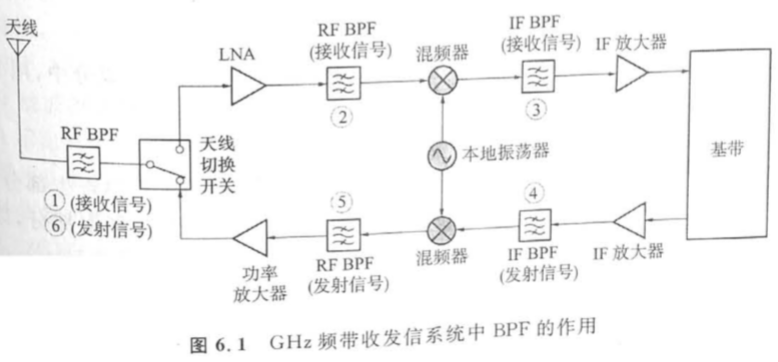 ①:RF BPF:从天线中取出期望频带的有效信号,滤除不需要频带的电磁波信号和噪声。