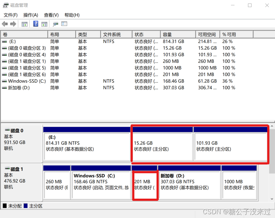 这里的分区我参考了b站的这位up主的视频,也就是在C盘后面和E盘后面分别分出了一个区,C盘后面分了一个200MB的小区域,用于后面做Ubuntu的EFI引导区,E盘后面划分的那个区域就是用来放Ubuntu系统的地方,建议留下100G以上的区域,我划分出120G大小的地方,图中上面的红框是两个分区是因为我已经安装好了Ubuntu,在安装Ubuntu的时候会将这个大的区域给分成两块。
