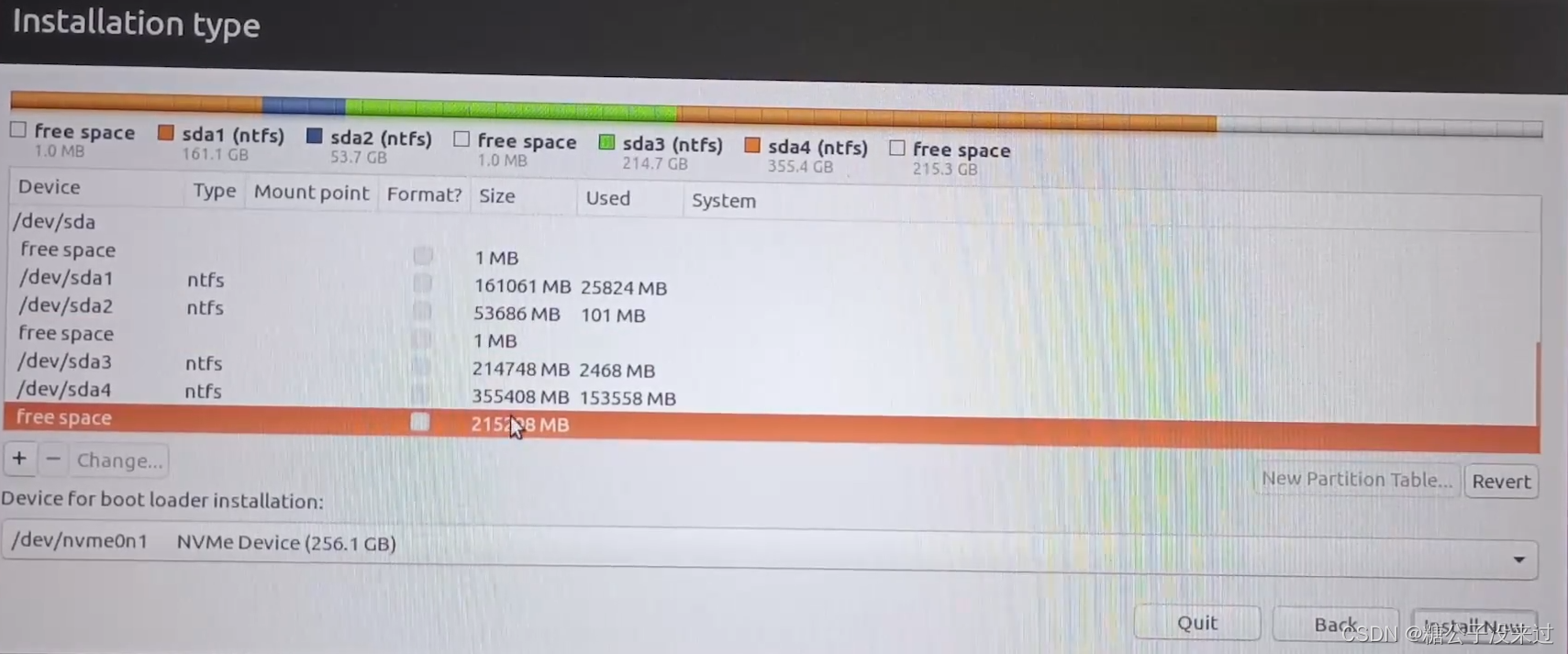接下来的“选择安装类型”(Installation type)比较关键,这里因为我们要安装双系统,因此这里一定选择最下面的“其他选项”(Something else)。