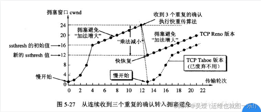 当发送方连续收到三个重复确认包时,就执行”乘法减小”算法,将把ssthresh门限减半。但是接下去并不执行慢开始算法。考虑到如果网络出现拥塞的话就不会收到好几个重复的确认,所有这是网络可能没有发生拥塞,所以此时不执行慢开始算法,而是将cwnd设置为ssthresh的大小,然后执行拥塞避免算法。