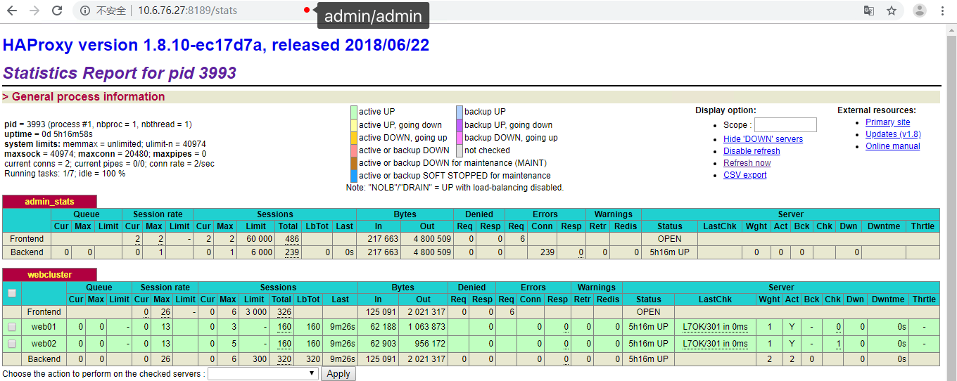 # cat /etc/haproxy/haproxy.cfg #--------------全局配置---------------- global log 127.0.0.1 local0 notice #配置全局日志记录,local0为日志设备,notice为输出的日志级别,表示使用本地(127.0.0.1)机器上的rsyslog服务中的local0设备记录日志等级为notice的日志。 #log loghost local0 info #定义haproxy 日志级别 maxconn 20480 #可以接收的最大并发连接数 #chroot /usr/local/haproxy-1.5.15 #工作目录 pidfile /var/run/haproxy.pid #haproxy 进程PID文件 #maxconn 4000 #最大连接数 user haproxy #运行的程序用户 group haproxy #运行的程序用户组 daemon #创建1个进程进入deamon模式运行,以后台形式运行harpoxy #--------------------------------------------------------------------- #common defaults that all the 'listen' and 'backend' sections will #use if not designated in their block #--------------------------------------------------------------------- defaults mode http #所处理的类别,tcp是四层,http是七层,health只会返回OK,若是混合模式则mode不需要设置 log global #定义日志,采用全局定义 option dontlognull #不记录健康检查的日志信息 option httpclose #每次请求完毕后主动关闭http通道 option httplog #日志类别为http日志格式;如果是混合模式,此处还需要加上tcpclog #option forwardfor #后端服务器可以从Http Header中获得客户端ip option redispatch #serverId对应的服务器挂掉后,强制定向到其他健康的服务器 balance roundrobin #设置默认负载均衡方式,轮询方式 timeout connect 10s #连接超时 timeout client 10s #客户端连接超时 timeout server 10s #服务器连接超时 timeout check 10s #健康检测的超时时间 maxconn 60000 #最大连接数 retries 3 #3次连接失败就为服务不可用 #--------------统计页面配置------------------ listen admin_stats #为haproxy访问状态监控页面配置,取名为admin_stats bind 0.0.0.0:8189 #监听端口 stats enable #启用监听端口 mode http #http的7层模式 log global # 继承global中log的定义 stats uri /stats #监控页面的url访问路径,即http://ip/stats访问监控页面 stats realm Haproxy Statistics #监控页面的密码框提示信息 stats auth admin:admin #监控页面的用户和密码admin,可以设置多个用户名 #stats hide-version #隐藏统计页面上HAProxy的版本信息 stats admin if TRUE #当通过认证才可管理 stats refresh 30s #页面自动刷新时间30s #---------------web设置----------------------- listen webcluster #定义webcluster服务器组。 bind 0.0.0.0:81 #定义haproxy前端部分监听的端口。 mode http #http的7模式 #option httpchk GET /index.html #心跳检测7层访问 log global #继承global中log的定义 maxconn 3000 #server进程可接受的最大并发连接数 balance roundrobin #负载均衡的方式:轮询 cookie SESSION_COOKIE insert indirect nocache #根据cookie轮询 server web01 10.6.76.27:1988 check inter 2000 fall 5 server web02 10.6.76.28:1988 check inter 2000 fall 5 #server web01 192.168.80.102:80 cookie web01 check inter 2000 fall 5 #server web02 192.168.80.103:80 cookie web01 check inter 2000 fall 5 # https://www.cnblogs.com/yangliheng/p/5852494.html