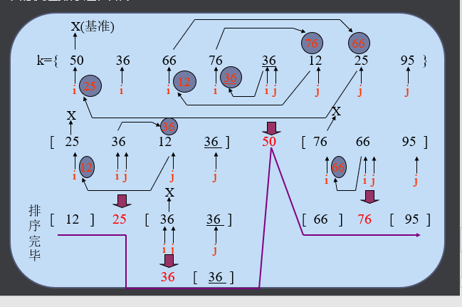 2、快速排序:设记录的key集合k={50,36,66,76,36,12,25,95},每次以集合中第一个key为基准的快速排序过程如下: