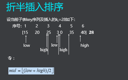 先将(R[1])看成一个子文件,然后依次插入R[2]……R[n]。但在插入R[i]时,子表[R[1]……R[i-1]]已是有序的,查找R[i]在子表中的位置可按折半查找方法进行,从而降低key的比较次数。
