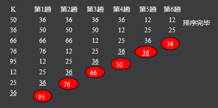 1、冒泡排序:设记录key集合k={50,36,66,76,95,12,25,36},排序过程如下:
