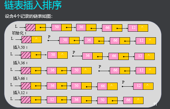 链表插入排序实际上是一个对链表遍历的过程。先将表置为空表,然后依次扫描链表中每个结点,设其指针为p,搜索到p结点在当前子表的适当位置,将其插入。