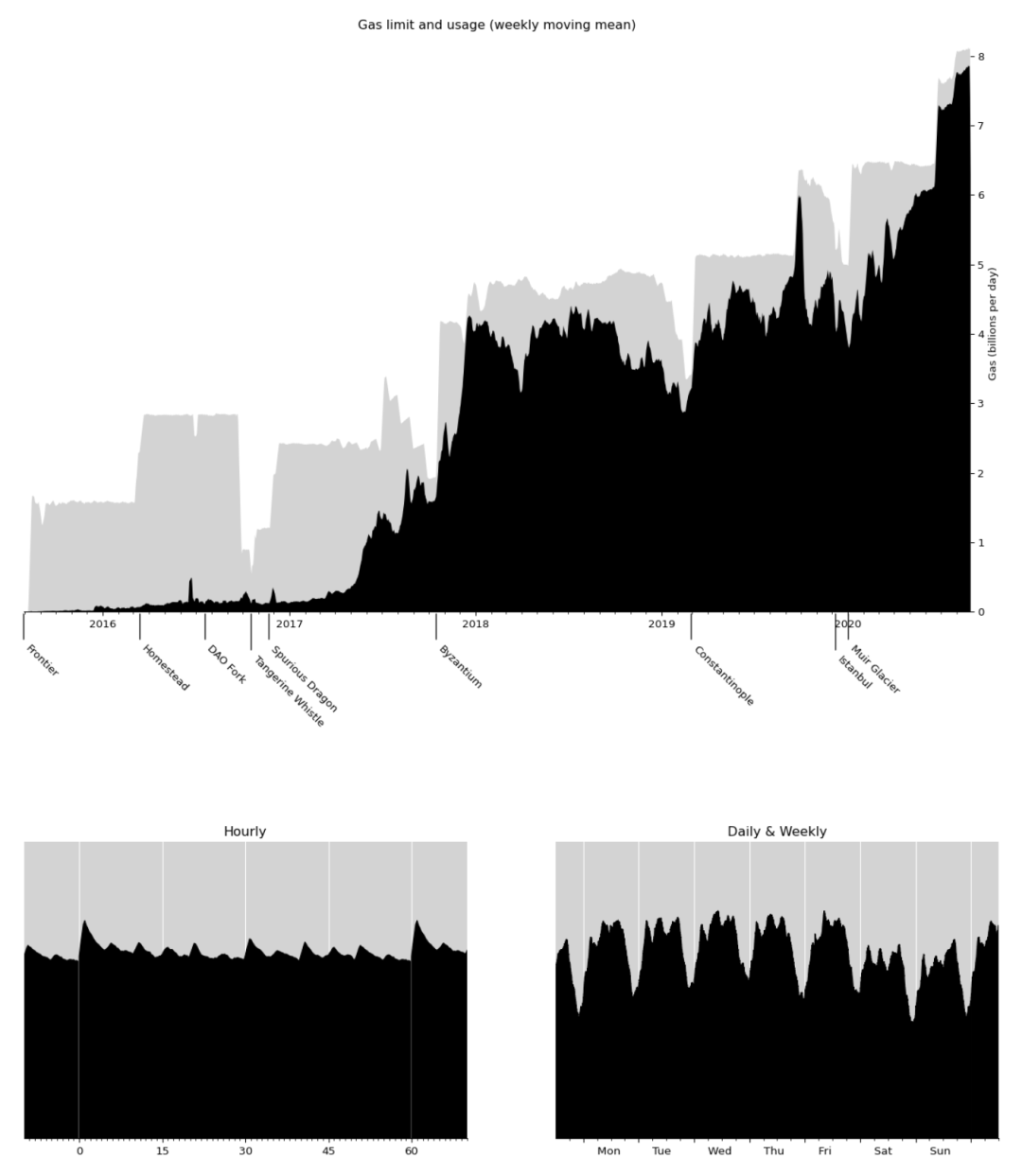 拜占庭 (Byzantium)、君士坦丁堡 (Constantinople) 和缪尔冰川 (Muir Glacier) 硬分叉之前,以太坊 gas 供应有几次断续下跌。这都是以太坊「难度炸弹」(也称为 「冰川时代」)的影响。