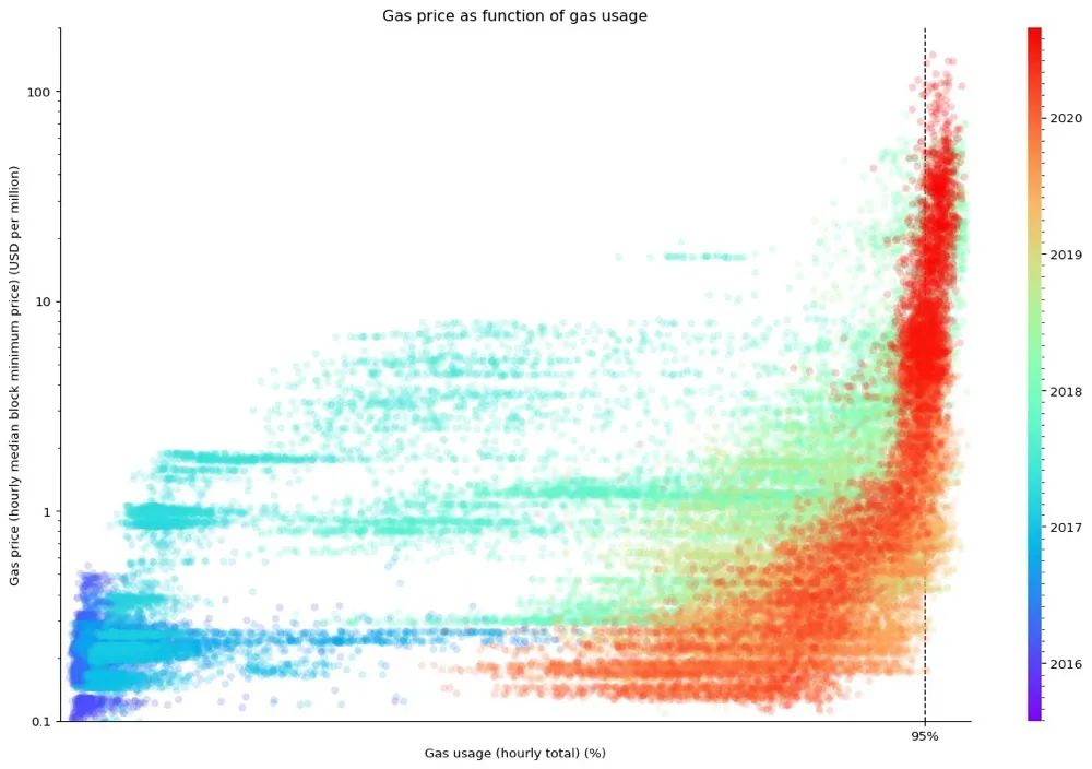 Gas 价格已成为「完美非弹性供应量」的教科书范本。随着网络使用率超过 80%,涨到 95% 位置,gas 价格明显增加。任何潜在需求增加只会增加价格,直到价格赶退需求,降回相同水平。