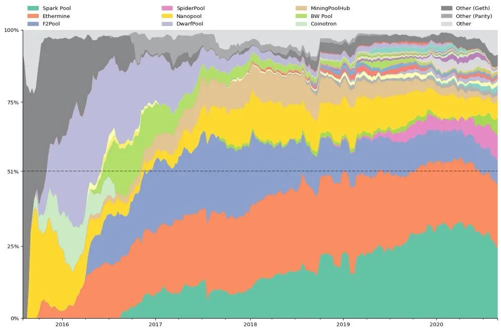 下面来看以太坊上矿池份额的发展情况: