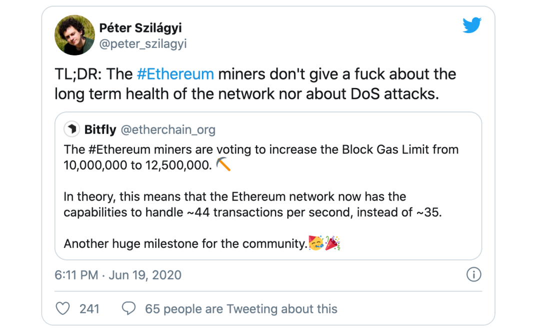 提高 gas 上限会对以太坊安全带来巨大隐患。如上所述,gas 上限会增加「叔块」率和空块率。正常交易负载下,这一增长很小。但对于安全问题,我们不关心正常行为,只关心糟糕情况下的不利行为。Perez 和 Livshits (2019 年) 研究了这种糟糕情况,结果就是同等 gas 成本下,糟糕时的交易要比正常交易慢百倍。需要九十秒区块才能填满交易。这就造成节点同步滞后,矿池挖「叔块」和空块。至本稿发布,问题已有缓解,但不足以避免。这就引致两位节点主开发者 Péter Szilágyi 和 Alexey Akhunov 批评提高 gas 上限的决定。