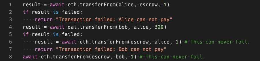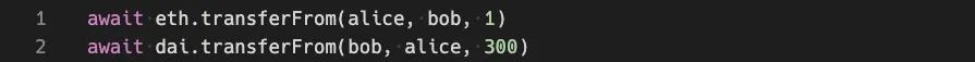 对于 DeFi,异步 transferFrom 调用构成很大挑战。设想双方进行简单交易,Alice 和 Bob 想要用 ETH 和 DAI 交易。基本合约应该是: