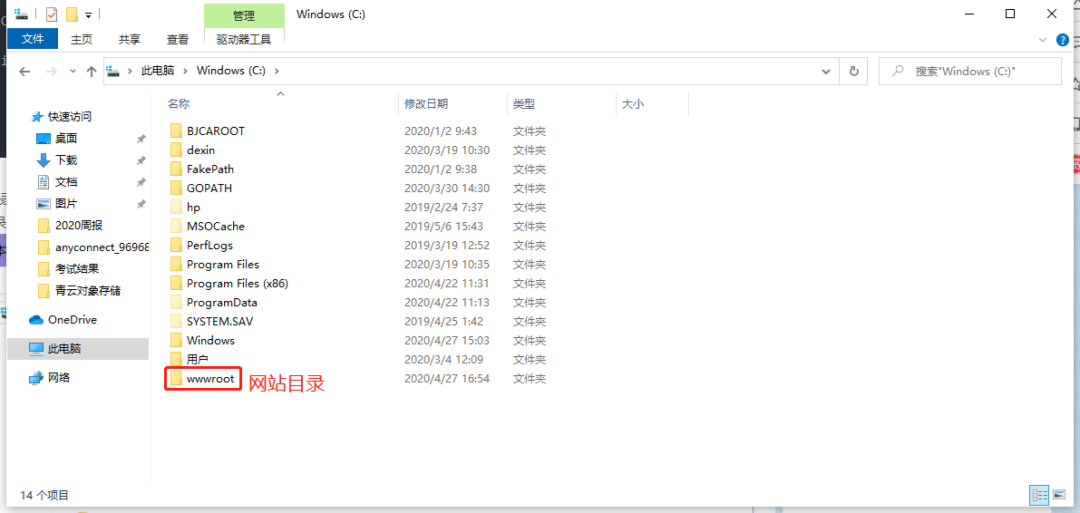 12.1、在C盘根目录创建网站目录,命名为"wwwroot"。