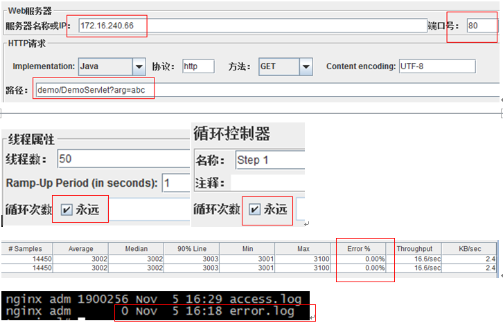 通过编程或工具,不断地向Nginx发送请求。观察请求响应情况,结合Nginx日志判断在服务切换过程中(8080 -> 9090),是否有请求丢失的情况。下面使用Jmeter演示: