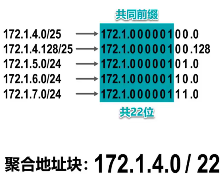 将多个IP地址的网络号共同前缀作为聚合地址块(除网络号外全取0)
