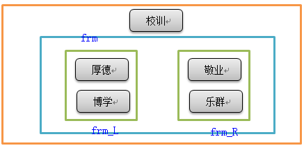 # -*- coding: cp936 -*- from Tkinter import * root = Tk() root.title("hello world") root.geometry('300x200') Label(root, text='校训'.decode('gbk').encode('utf8'), font=('Arial', 20)).pack() frm = Frame(root) #left frm_L = Frame(frm) Label(frm_L, text='厚德'.decode('gbk').encode('utf8'), font=('Arial', 15)).pack(side=TOP) Label(frm_L, text='博学'.decode('gbk').encode('utf8'), font=('Arial', 15)).pack(side=TOP) frm_L.pack(side=LEFT) #right frm_R = Frame(frm) Label(frm_R, text='敬业'.decode('gbk').encode('utf8'), font=('Arial', 15)).pack(side=TOP) Label(frm_R, text='乐群'.decode('gbk').encode('utf8'), font=('Arial', 15)).pack(side=TOP) frm_R.pack(side=RIGHT) frm.pack() root.mainloop()