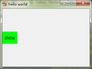 # -*- coding: cp936 -*- from Tkinter import * root = Tk() root.title("hello world") root.geometry('300x200') l = Label(root, text="show", bg="green", font=("Arial", 12), width=5, height=2) l.pack(side=LEFT) #这里的side可以赋值为LEFT RTGHT TOP BOTTOM root.mainloop()
