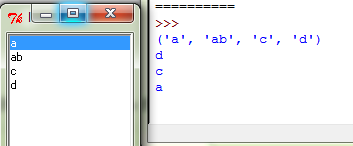 var.set(('a', 'ab', 'c', 'd')) #重新设置了,这时控件的内容就编程var的内容了 print var.get() lb.bind('<ButtonRelease-1>', print_item) lb.pack() root.mainloop()