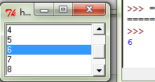 from Tkinter import * root = Tk() root.title("hello world") root.geometry() def print_item(event): print lb.get(lb.curselection()) var = StringVar() lb = Listbox(root, height=5, selectmode=BROWSE, listvariable = var) lb.bind('<ButtonRelease-1>', print_item) list_item = [1, 2, 3, 4, 5, 6, 7, 8, 9, 0] for item in list_item: lb.insert(END, item) scrl = Scrollbar(root) scrl.pack(side=RIGHT, fill=Y) lb.configure(yscrollcommand = scrl.set) lb.pack(side=LEFT, fill=BOTH) scrl['command'] = lb.yview root.mainloop()