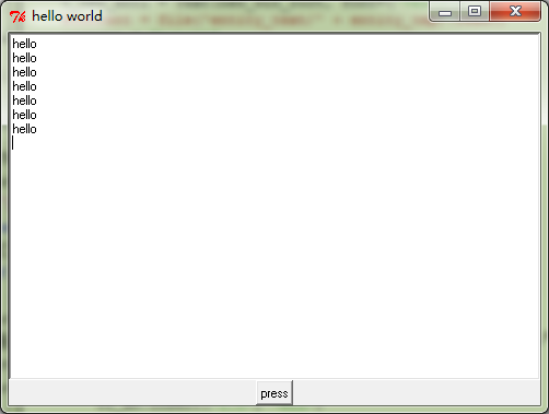 # -*- coding: cp936 -*- from Tkinter import * root = Tk() root.title("hello world") root.geometry() def printhello(): t.insert('1.0', "hellon") t = Text() t.pack() Button(root, text="press", command = printhello).pack() root.mainloop()