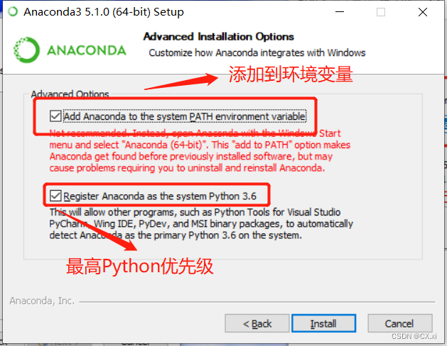刚刚入门的新手小白注意了,文件名最好养成用英文的习惯,很多软件不支持中文识别,会导致无法使用的情况,尤其是系统文件的命名,可以用英文和数字,不然对于刚刚入门的计算机系同学来说后期会有很多麻烦哟!安装Anaconda的时候电脑最好没有安装Python,有的话最好卸载掉,因为Anaconda自带Python,环境变量会有冲突(来看这个安装教程的大都是新手小白,这是解决这个问题最简单直接的方法)